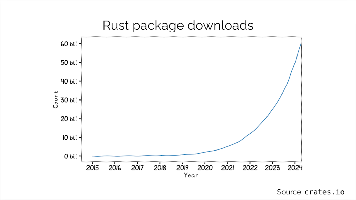 And the number of crates (libraries) downloaded from crates.io has grown exponentially: