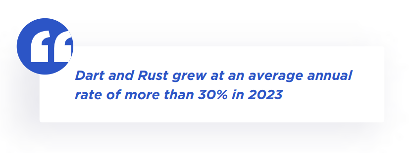 As is widely known, Rust has been Stack Overflows 'most loved language' since 2016, and became 'most admired' in 2023 1. In the same vein, Rust (together with Dart) was the fastest growing community (i.e. number of developers) in 2023, nearly doubling in size from 2022 to 2024: