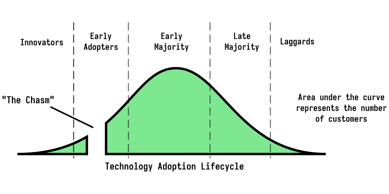 You might recognize the image below as the well-known Technology Adoption Lifecycle. It goes without saying that Rust is still in the early stages.
