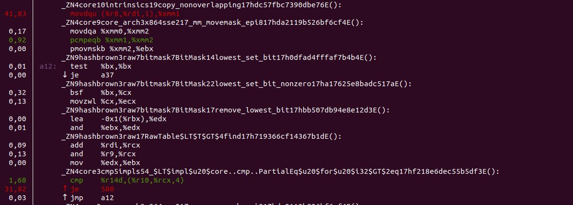 The lines in white, starting with _ZN, are the mangled names of the functions to which the instructions below them belong. Both red colored instructions are inside Rust’s std::collections::HashSet implementation. It would seem that mimicking jLZJD’s IntSetNoRemove in LZJS-rs or providing another more tailor-made HashSet implementation could benefit the performance LZJS-rs.