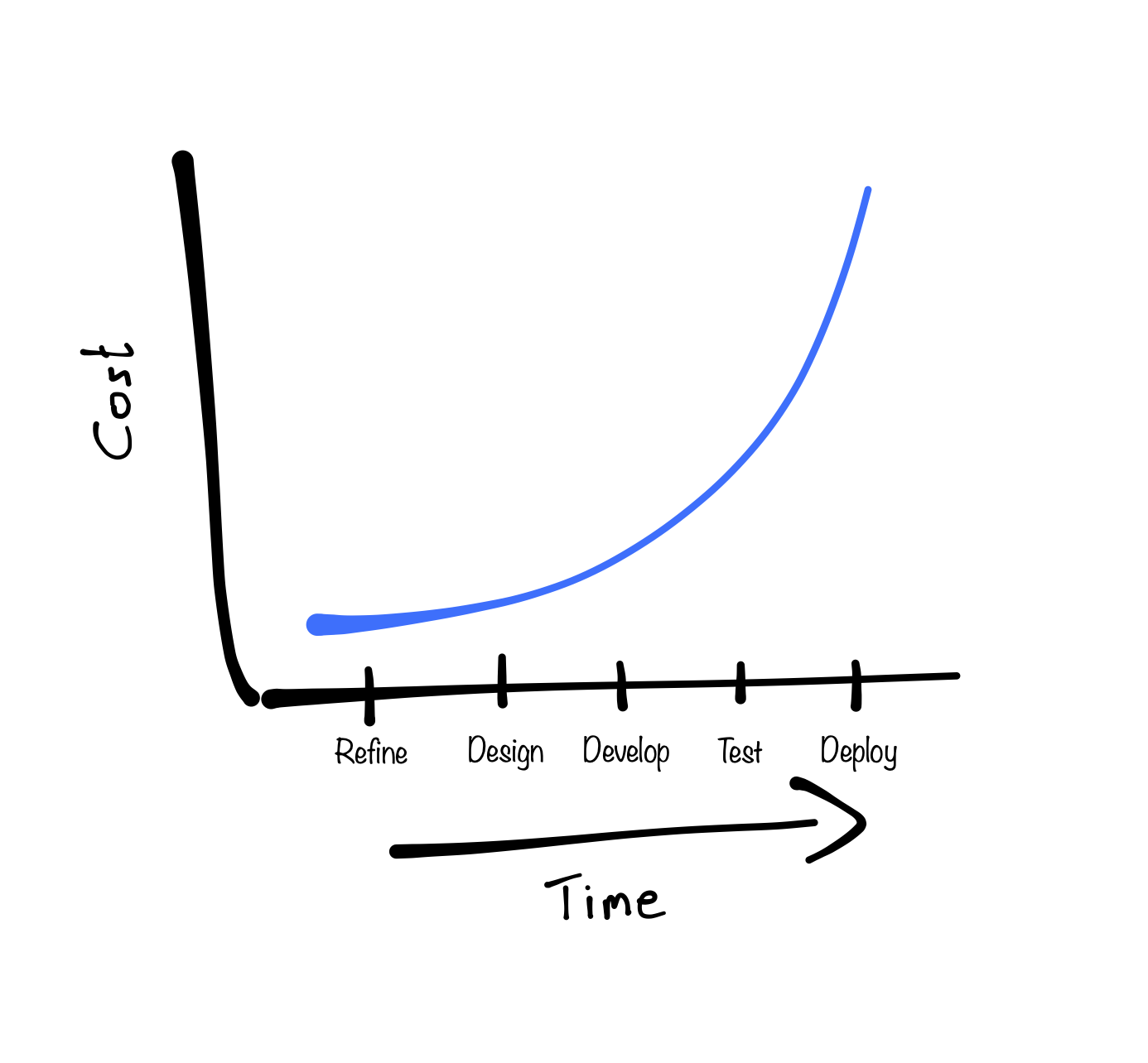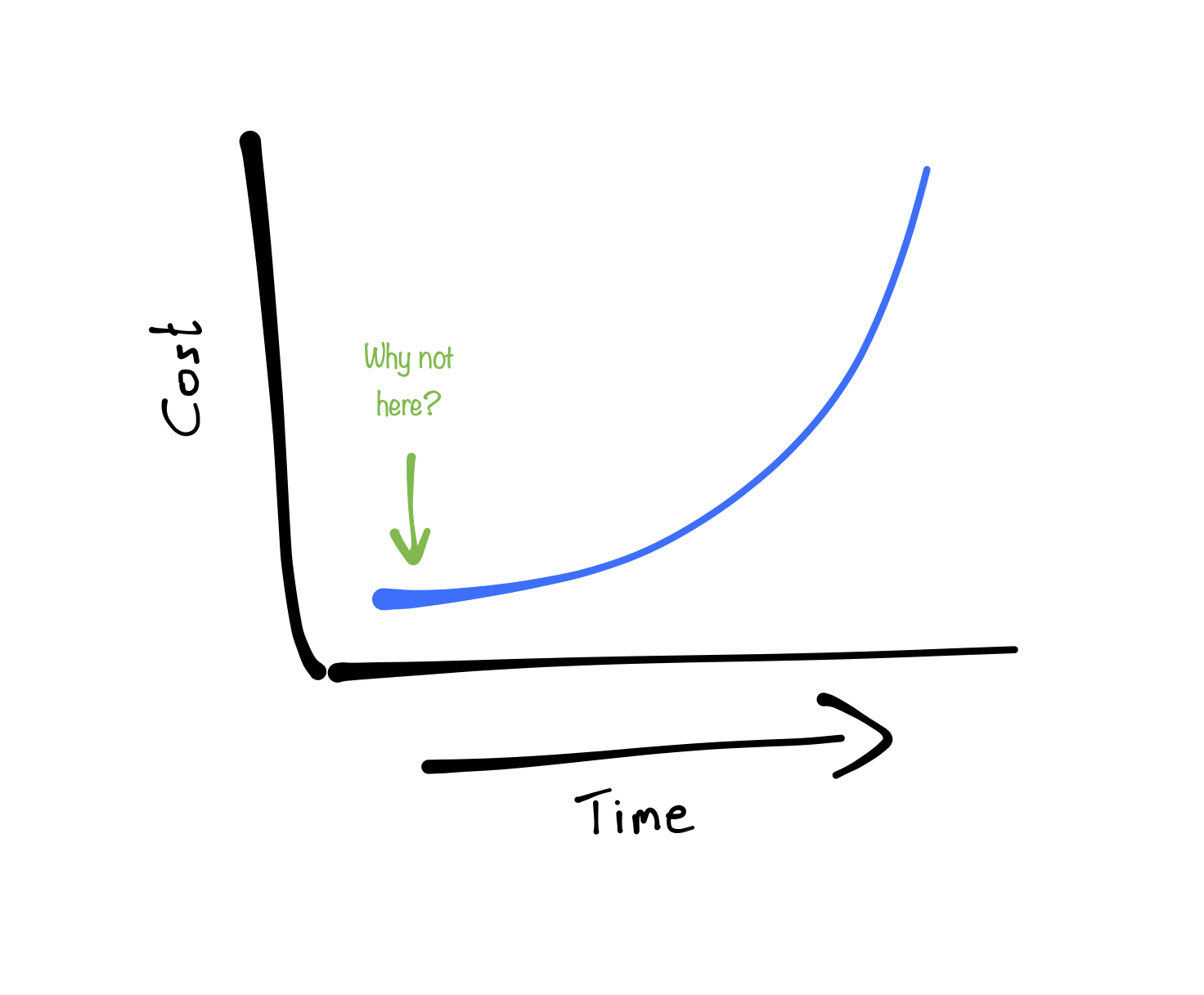 Most people may recognise the following graph (even though I drew this particular one myself). It illustrates that the further you are in a project, the higher the costs of fixing a security bug are.
