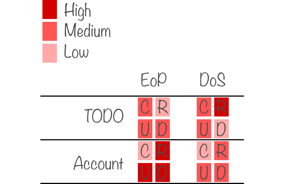 Using the intended actions, for each asset one assesses the risks of an "Escalation of Privilege" (EoP) and a "Denial of Service" (DoS), which we call the "Failure Cases". If you're familiar with STRIDE, you could see this as a simplification of the threats to just the "unintended actions" and "denial of intended actions".